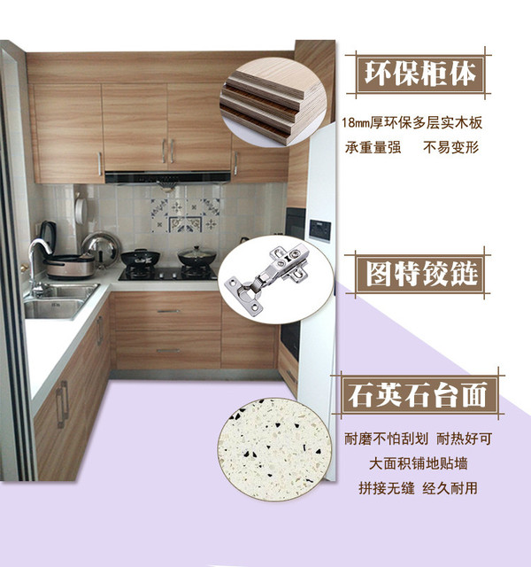 柜體平安樹實木多層板(桉木芯E0級),臺面石英石(單色),品牌圓管不銹鋼拉籃,碗籃,調味籃,品牌不銹鋼阻尼鉸鏈,拉手(樣式可自選)三組海蒂詩導軌抽屜。